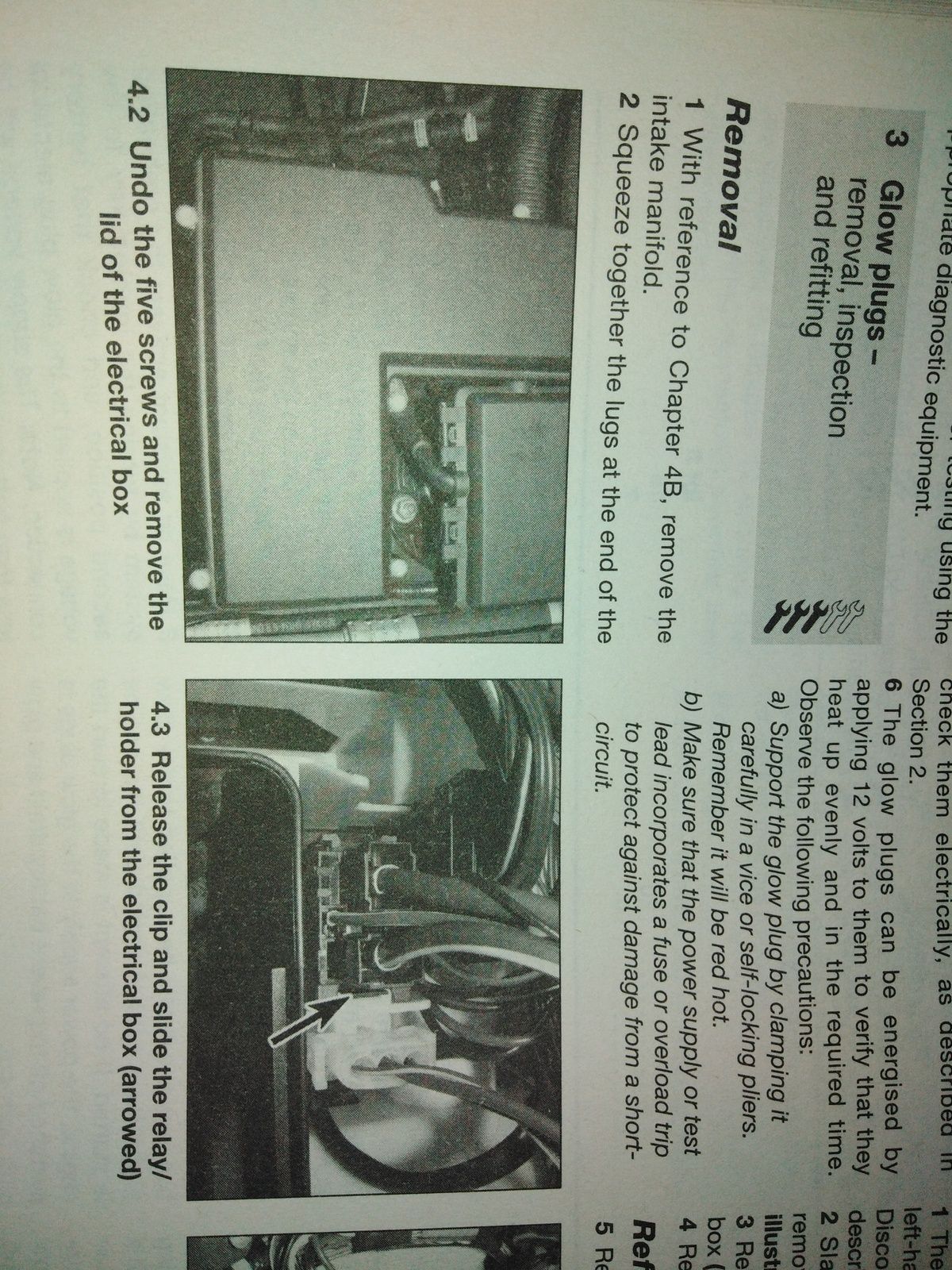 On my 2002 td4 there is a relay for the glow plugs in the lshaped ecu box you said. The main fusebox is located behind the driver's storage area. There are three phases of glow plug heating: You need to remove the inlet manifold to see it. The lower the ect, the longer the heating times. On checking the glow plug lamp doesnt illuminate at all any more im sure it did last week!